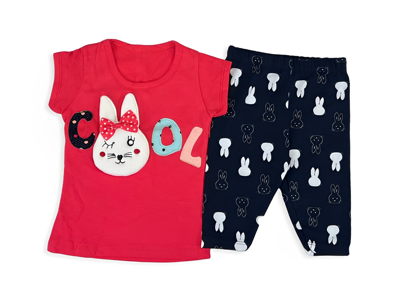 Το σετ αποτελείται από μία κοντομάνικη μπλουζίτσα και ένα παντελονάκι κολάν κάπρι. Η μπλουζίτσα είναι σε ροδί χρώμα με σχέδιο ζωάκι λαγουδάκι και φιογκάκι του οποίο το κεφάλι είναι τρισδιάστατο (3D) και γράφει “Cool”.. Το παντελονάκι είναι κολάν κάπρι σε σκούρο μπλε χρώμα με σχέδιο πολλά λαγουδάκια και έχει λάστιχο περιμετρικά στη μέση.