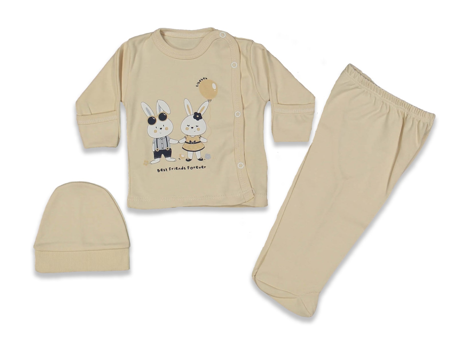 Το σετ αυτό είναι βρεφικό και αποτελείται από ζακετάκι με παντελονάκι και σκουφάκι. Το ζακετάκι έχει σχέδιο στάμπα λαγουδάκια με μπαλόνι και γράφει “Best Friends Forever” και είναι σε μπεζ χρώμα όπως το παντελονάκι και το σκουφάκι. Το ζακετάκι έχει τρουκς στο εμπρός μέρος και η μανσέτα στο τελείωμά της γίνεται γαντάκι, για να προστατεύεται από τα νυχάκια του το μωρό. Το παντελονάκι έχει κλειστά ποδαράκια και λάστιχο περιμετρικά στη μέση.