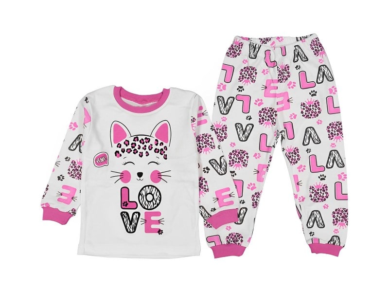 Το σετ αυτό αποτελείται από μπλούζα και παντελόνι. Η μπλουζίτσα είναι σε άσπρο – φούξια χρώμα έχει σχέδιο λεοπάρ γατούλα και γράφει “Love”. Το παντελονάκι είναι στο ίδιο σχέδιο και έχει λάστιχο περιμετρικά στη μέση και στο κάτω μέρος.