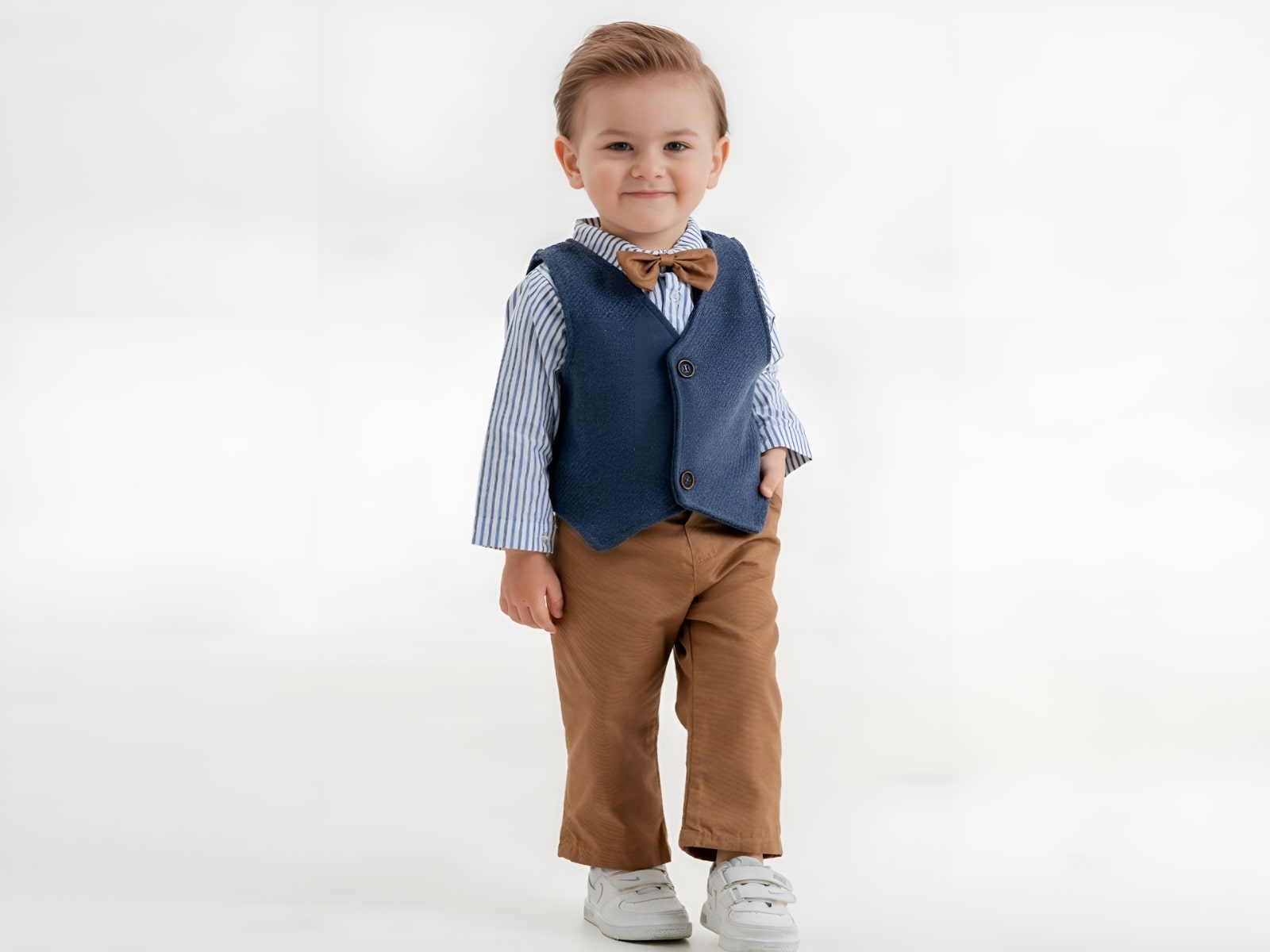 Σετ που αποτελείται από πουκαμισάκι με αποσπώμενο παπιγιόν, τιράντες και παντελόνι, για επίσημες εμφανίσεις. Το πουκάμισο έχει σχέδιο με ρίγες σε γαλάζιο και άσπρο χρώμα και ανοίγει με κουμπάκια. Το παπιγιόν είναι σε καφέ χρώμα. Το παντελονάκι είναι καμπαρντινέ σε καφέ χρώμα και έχει άνοιγμα με κουμπακι και φερμουάρ. Το γιλέκο είναι αποσπώμενο σε σκούρο μπλε χρώμα και έχει δύο κουμπάκια.