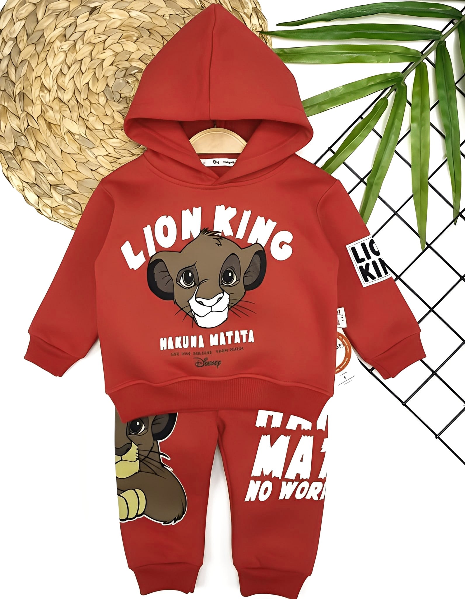 Το σετ αποτελείται από βρεφική μπλούζα και παντελόνι και είναι χειμερινό, με εσωτερική επένδυση χνούδι φλις (fleece). Η μπλουζίτσα είναι σε κόκκινο χρώμα με κουκούλα και έχει σχέδιο στάμπα τον αγαπημένο λιονταράκι των παιδιών. Το παντελονάκι είναι σε κόκκινο χρώμα και έχει λάστιχο περιμετρικά στη μέση και στο κάτω μέρος.