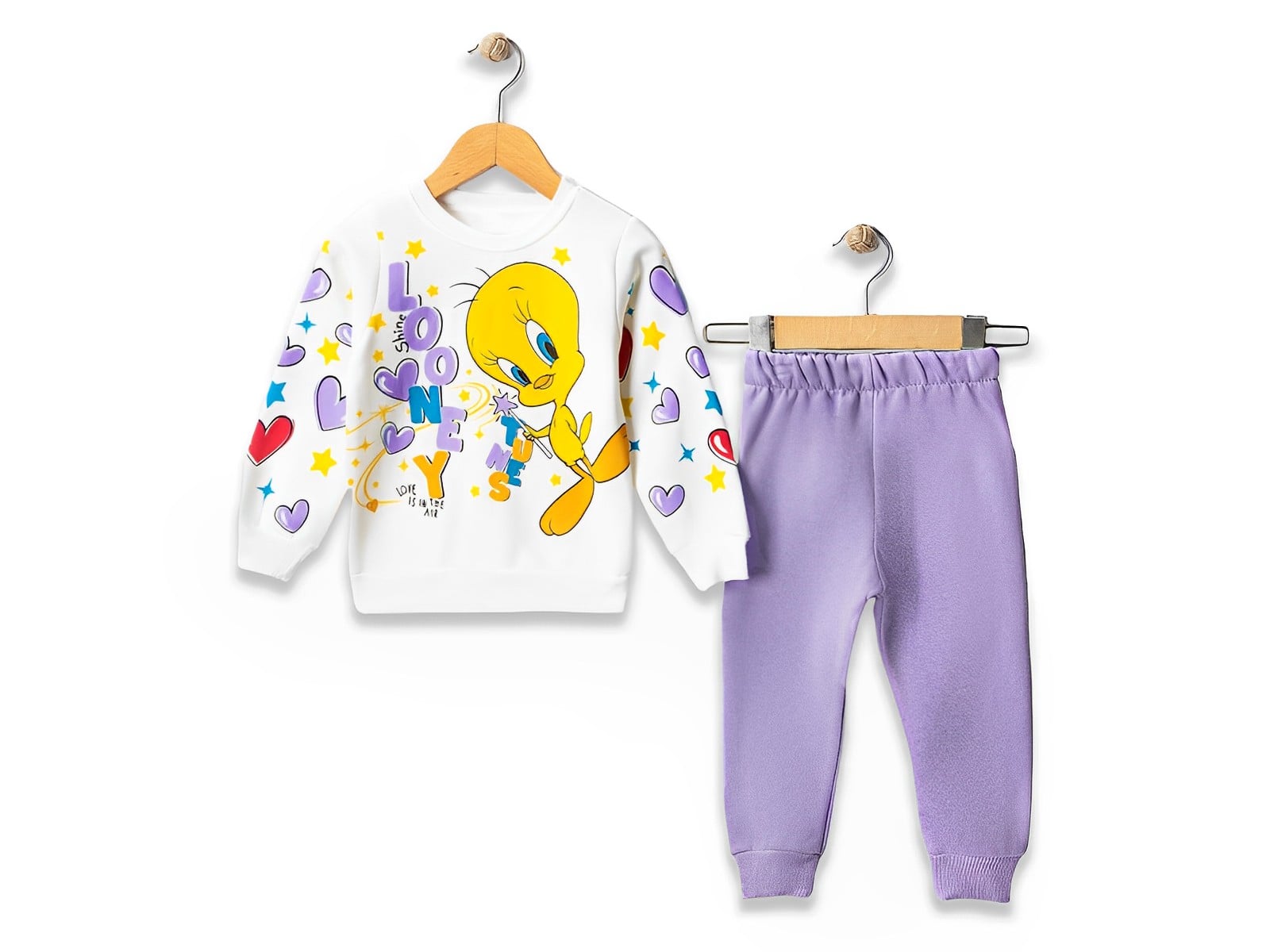 Το σετ αποτελείται από βρεφική μπλούζα και παντελόνι και είναι χειμερινό, με εσωτερική επένδυση χνούδι φλις (fleece). Η μπλουζίτσα είναι σε άσπρο χρώμα με σχέδιο στάμπα αγαπημένη πουλάκι κινουμένων σχεδίων. Το παντελονάκι είναι σε λιλά χρώμα και έχει λάστιχο περιμετρικά στη μέση και στο κάτω μέρος.