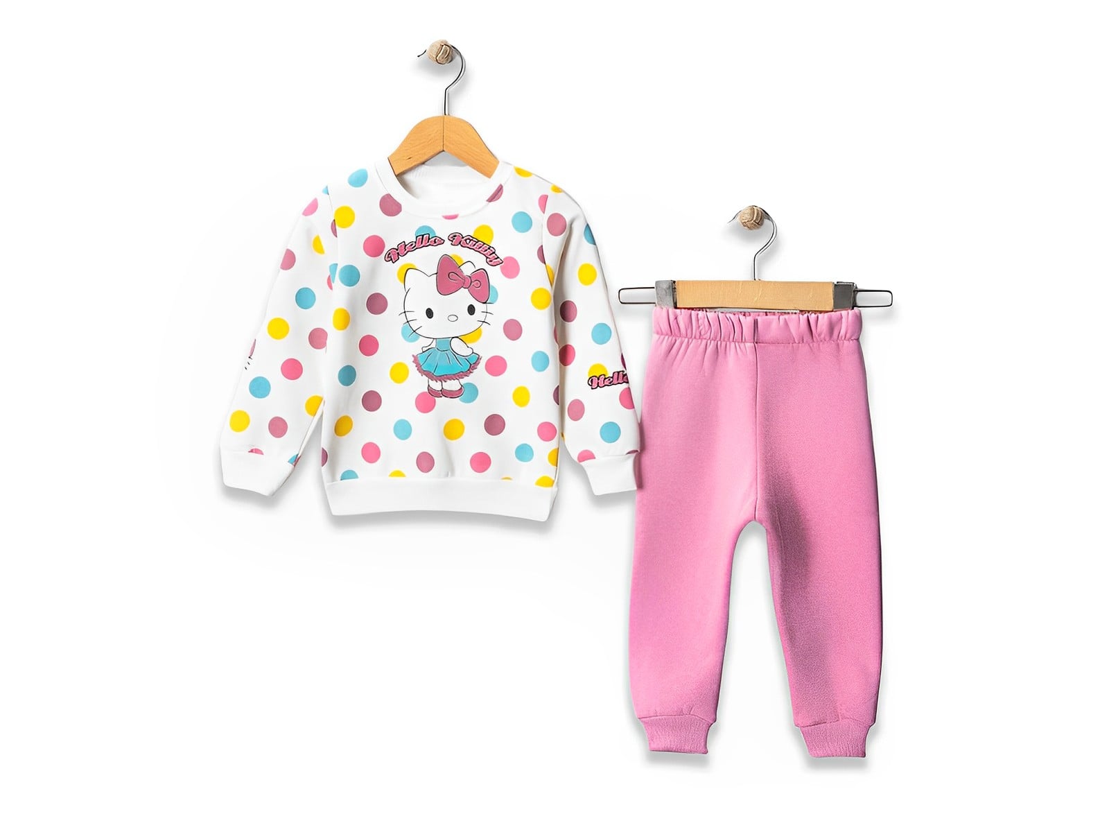 Το σετ αποτελείται από βρεφική μπλούζα και παντελόνι και είναι χειμερινό, με εσωτερική επένδυση χνούδι φλις (fleece). Η μπλουζίτσα είναι σε άσπρο χρώμα με σχέδιο στάμπα αγαπημένη γατούλα κινουμένων σχεδίων. Το παντελονάκι είναι σε ροζ χρώμα και έχει λάστιχο περιμετρικά στη μέση και στο κάτω μέρος.