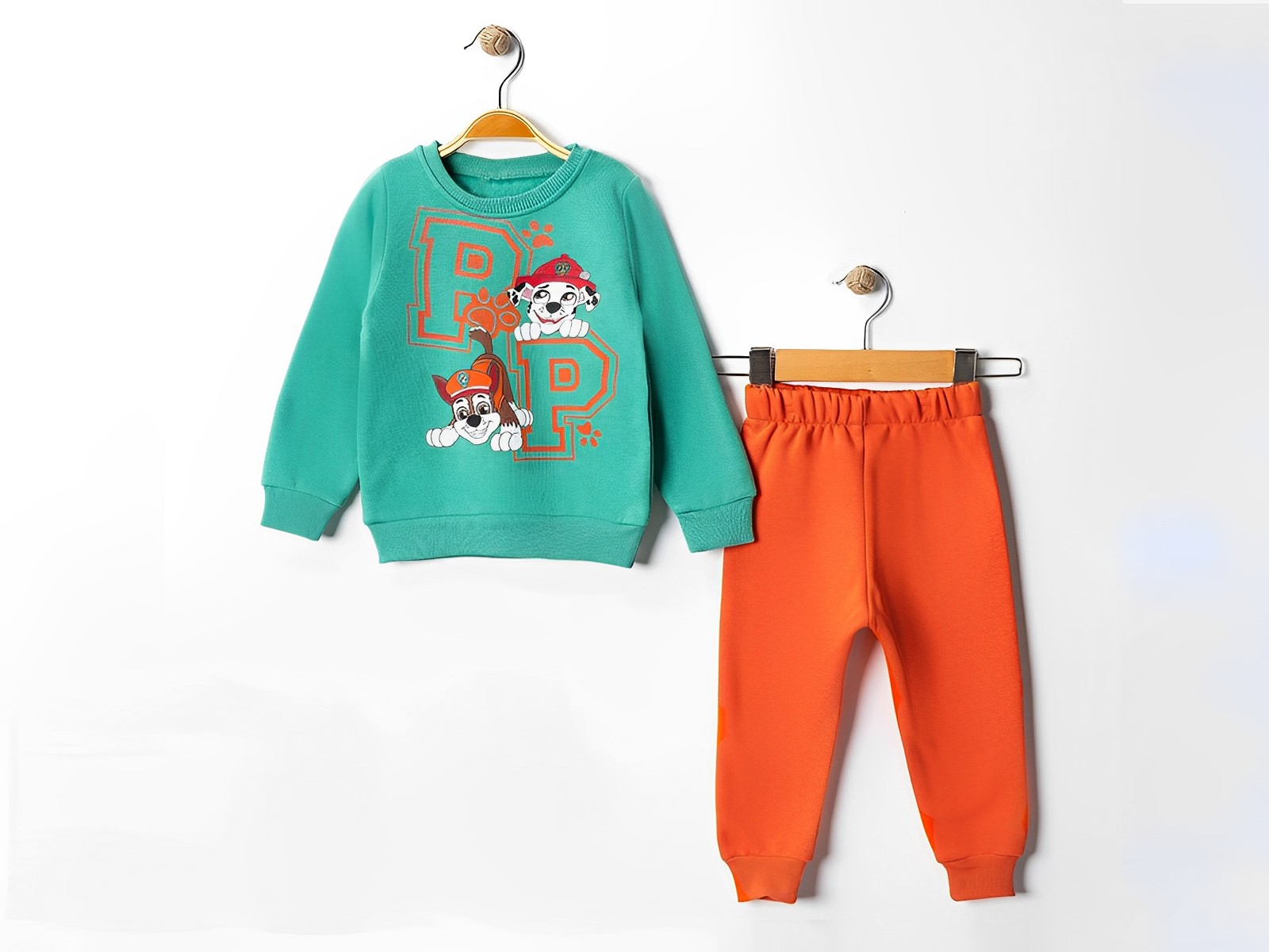 Το σετ αποτελείται από βρεφική μπλούζα και παντελόνι και είναι χειμερινό, με εσωτερική επένδυση χνούδι φλις (fleece). Η μπλουζίτσα είναι σε βεραμάν χρώμα με σχέδιο στάμπα αγαπημένο ήρωα σκυλάκι κινουμένων σχεδίων των παιδιών. Το παντελονάκι είναι σε πορτοκαλί χρώμα και έχει λάστιχο περιμετρικά στη μέση και στο κάτω μέρος.