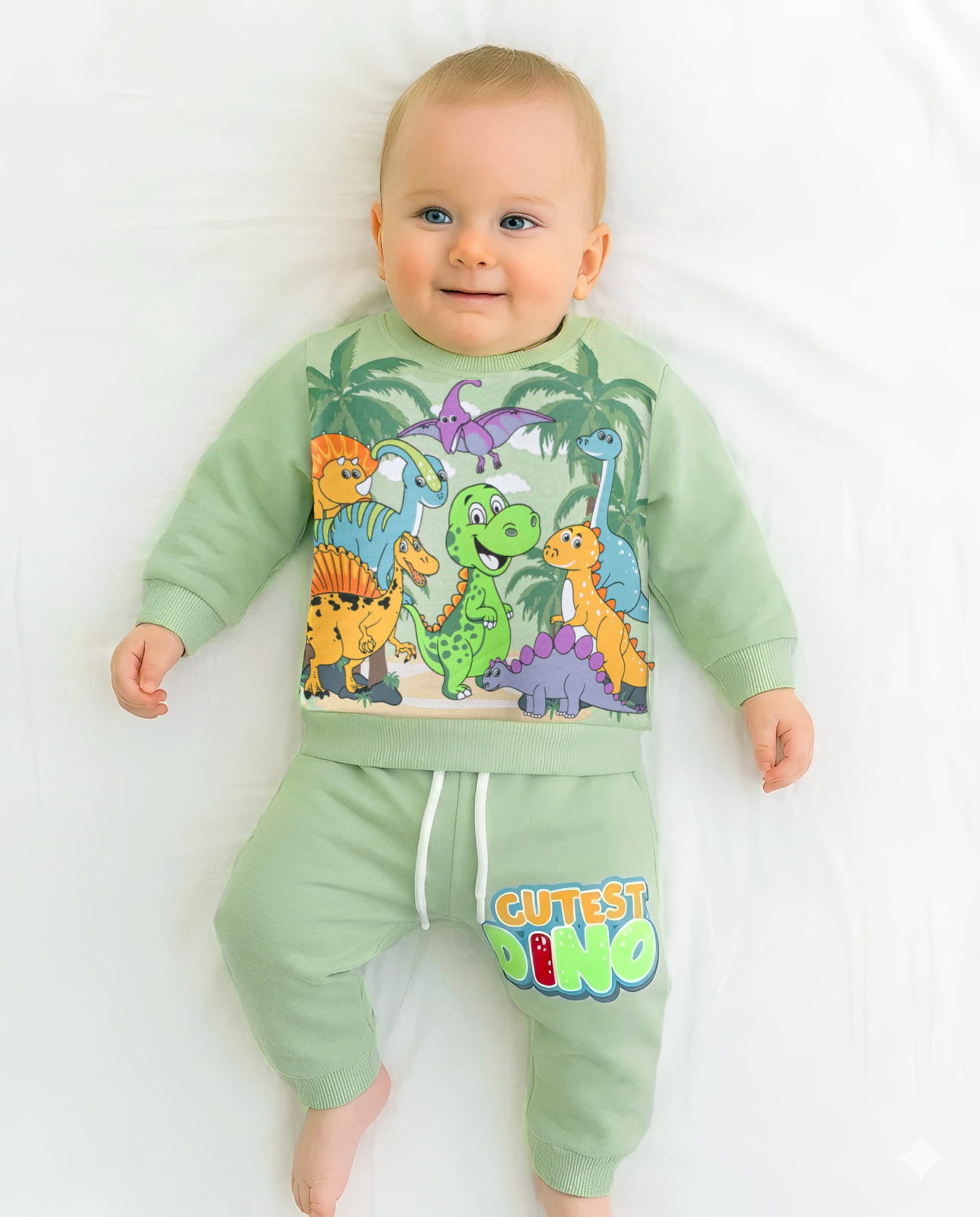 - 👖 Παντελόνι: Σε ασορτί βεραμάν χρώμα, με λευκό κορδόνι στη μέση για σωστή εφαρμογή, ελαστικά ρεβέρ στο κάτω μέρος και το λογότυπο “CUTEST DINO” στο πλάι.