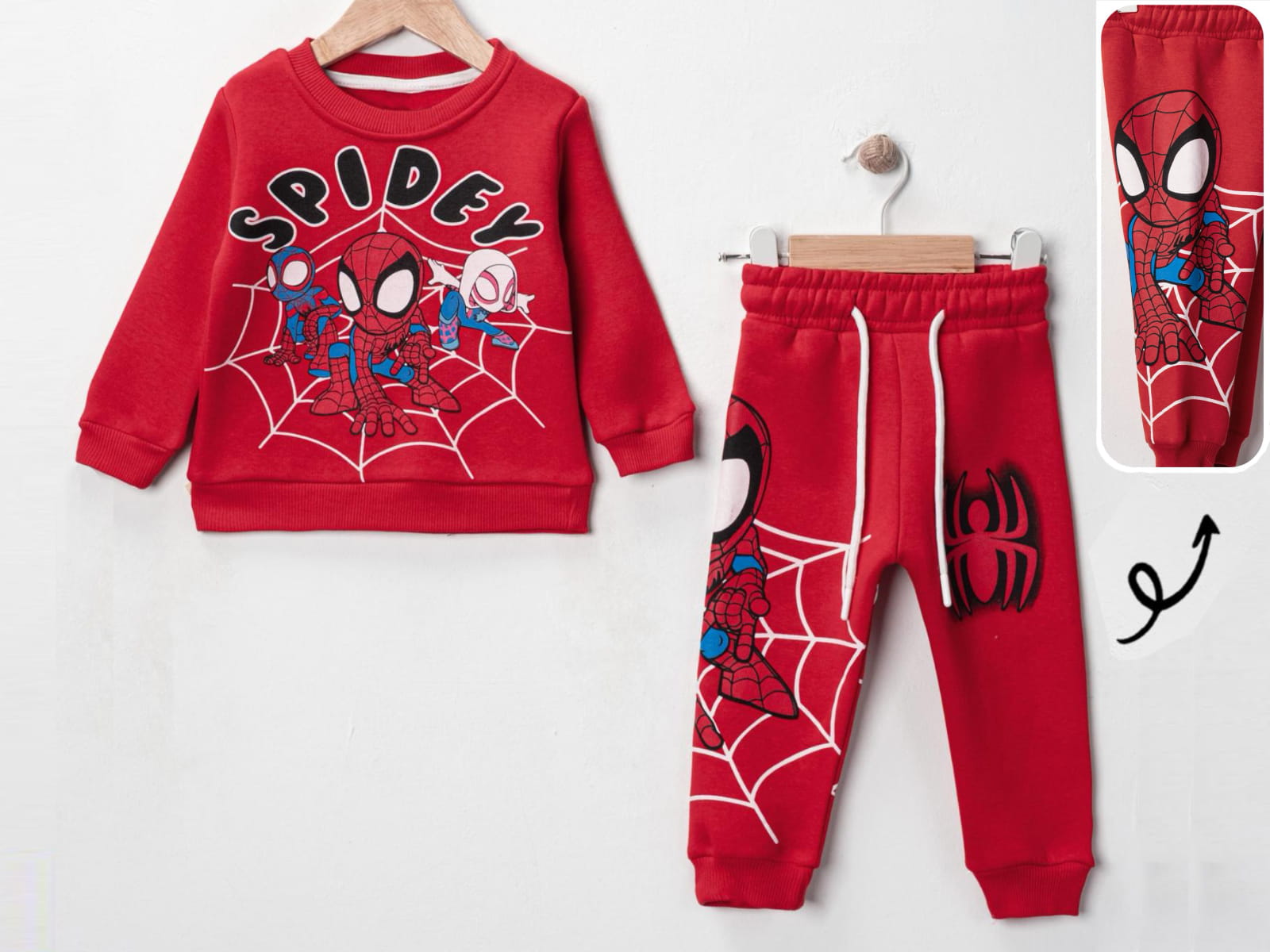 - 👖 Παντελόνι: Σε ασορτί κόκκινο χρώμα, με λευκό κορδόνι στη μέση για σωστή εφαρμογή, ελαστικά ρεβέρ στο κάτω μέρος και μεγάλη στάμπα με τον αγαπημένο υπερήροα στο πλάι και το χαρακτηριστικό του έμβλημα.