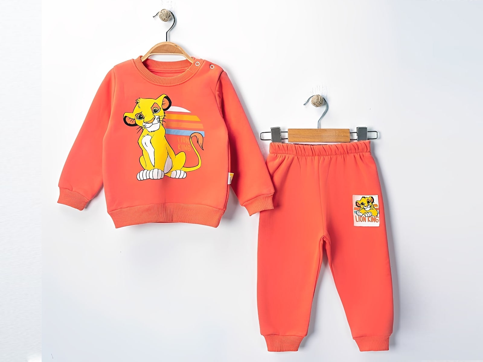 Το σετ αποτελείται από βρεφική μπλούζα και παντελόνι και είναι χειμερινό, με εσωτερική επένδυση χνούδι φλις (fleece). Η μπλουζίτσα είναι σε κοραλί χρώμα με σχέδιο στάμπα το αγαπημένο λιονταράκι των μικρών παιδιών. Το παντελονάκι είναι στην ίδια απόχρωση με στάμπα στο μπατζάκι και έχει λάστιχο περιμετρικά στη μέση και στο κάτω μέρος για τέλεια εφαρμογή.