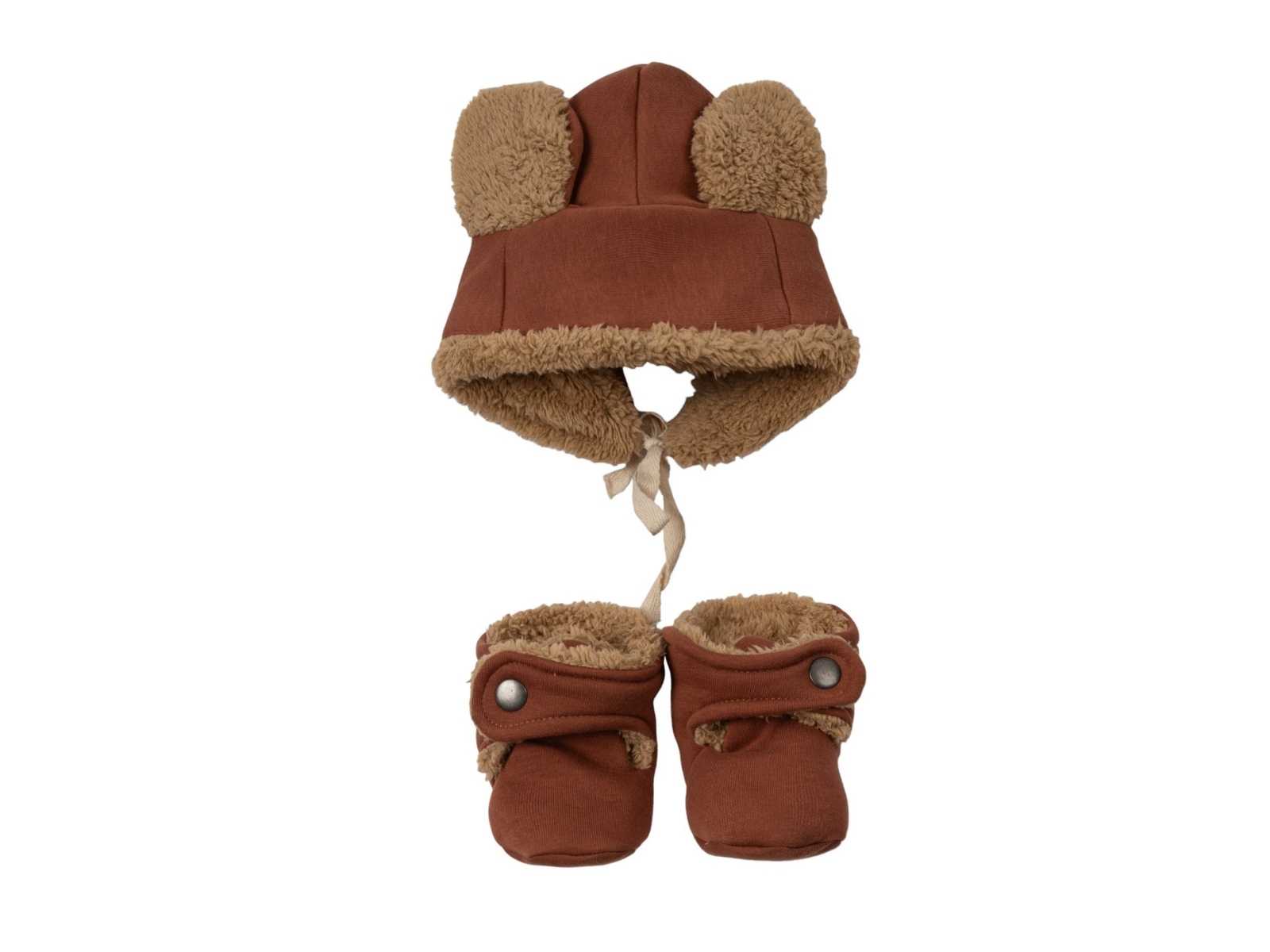 Βρεφικό σκουφάκι με αυτάκια σε καφέ χρώμα και παντοφλάκια αγγαλιάς με επένδιση fleece (φλις). Για ηλικίες 6-12 μηνών.