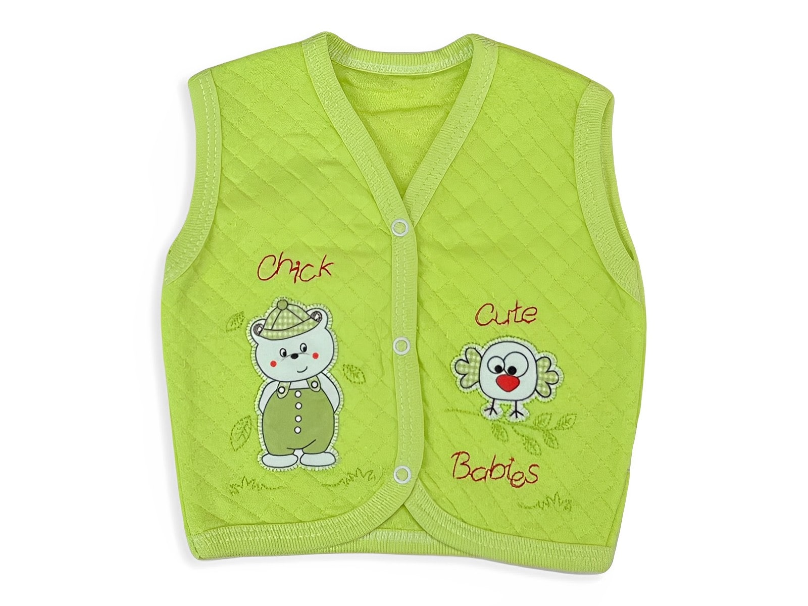 Βρεφικό ζακετάκι αμάνικο το οποίο έχει άνοιγμα με τρουκς (κόπιτσες) για μεγαλύτερη ευκολία και είναι σε λαχανί χρώμα. Έχει σχέδιο απλικέ ζωάκια λαγουδάκι και αρκουδάκι και γράφει “Cute Babies”.