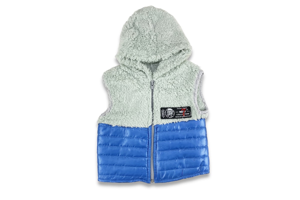 Ζακετάκι αμάνικο fleece (φλις) με κουκούλα και απλικέ σχέδιο, σε πράσινο χρώμα, ενώ το κάτω μέρος είναι μπλε.